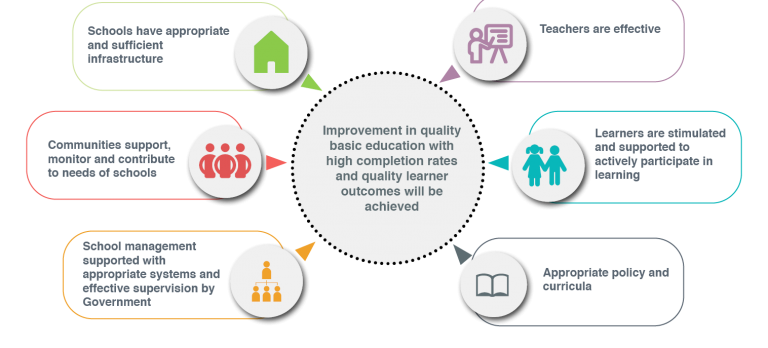 “If, Teachers are effective, Learners are stimulated and supported to actively participate in learning based on appropriate policy and curricula, school management supported with appropriate systems and effective supervision by Government; schools have appropriate and sufficient infrastructure; and communities are empowered and involved in to support, monitor and contribute to identified needs of schools, then improvement in quality basic education with high completion rates and quality learner outcomes will be achieved.”